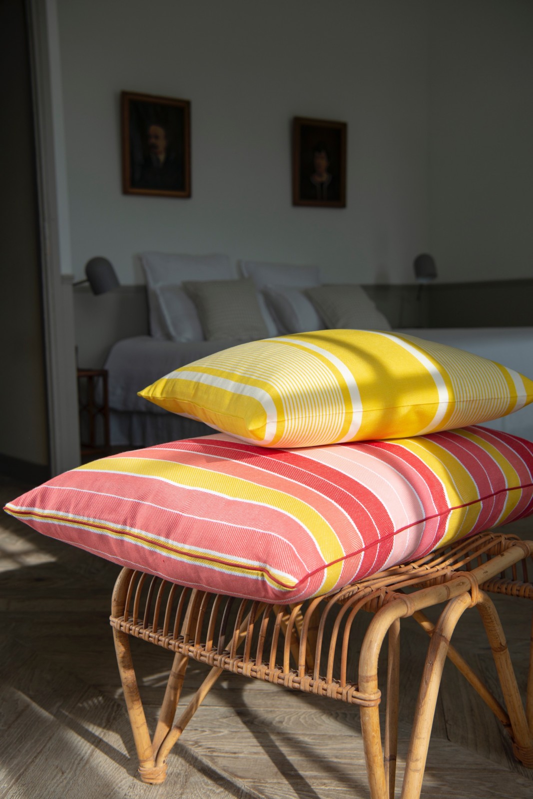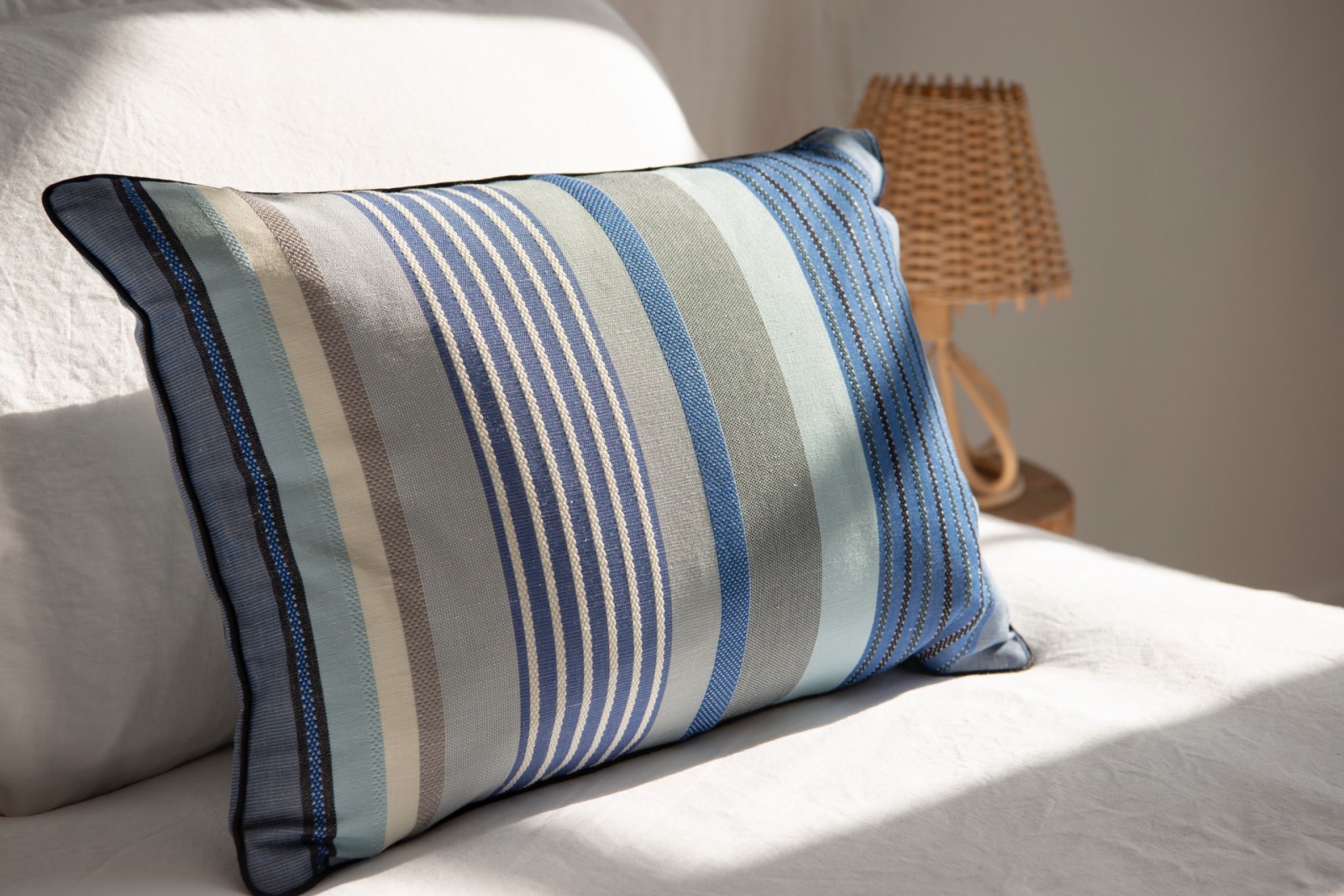 Découvrez cette collection de linge de maison à rayure pour votre intérieur et votre extérieur. Cette collection, fabriquée en France, comprend différents coussins, plaids et chaises longues, avec différentes couleurs et matières (lin et coton biologique).